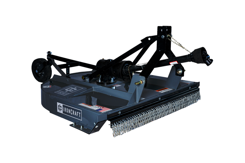 These Roundback Cutters are designed for heavy-duty applications such as weeds, grass, and brush up to 2.5” or 3” diameter, depending on model. These cutters are designed to work with 35 to 95 hp tractors, and are available in 60”, 72”, and 84” widths. These cutters use a single spindle with two free-swinging blades, which reduce the shock of impact when a stationary object is contacted. A slip clutch, if equipped, protects the gearbox and driveline from damage. Standard equipment includes driveline shields and clutch shields. Front and rear chain and rubber discharge shields are available.